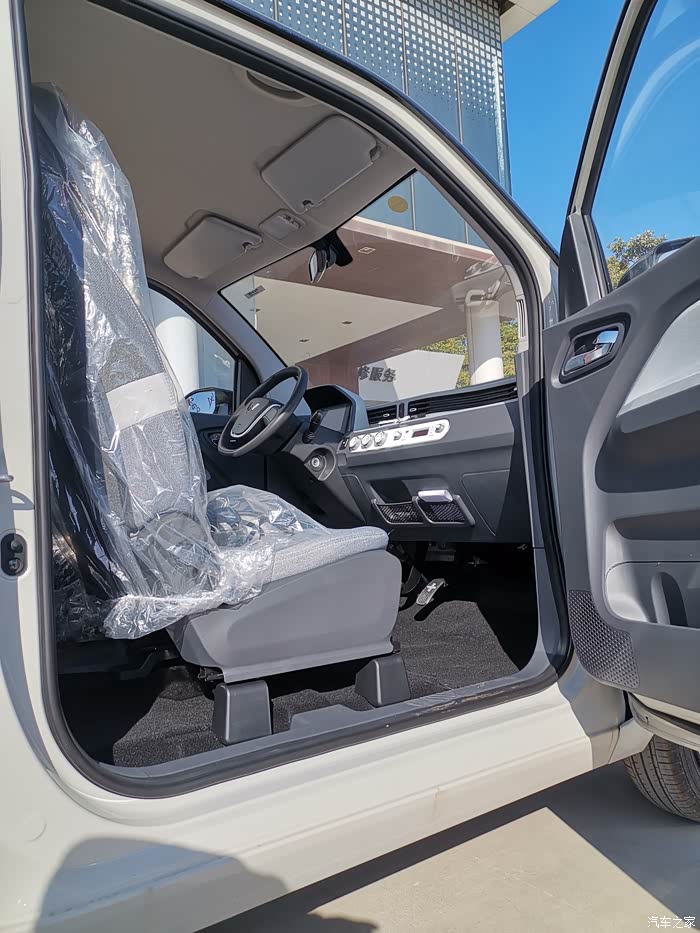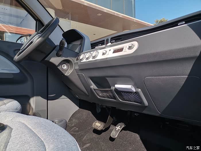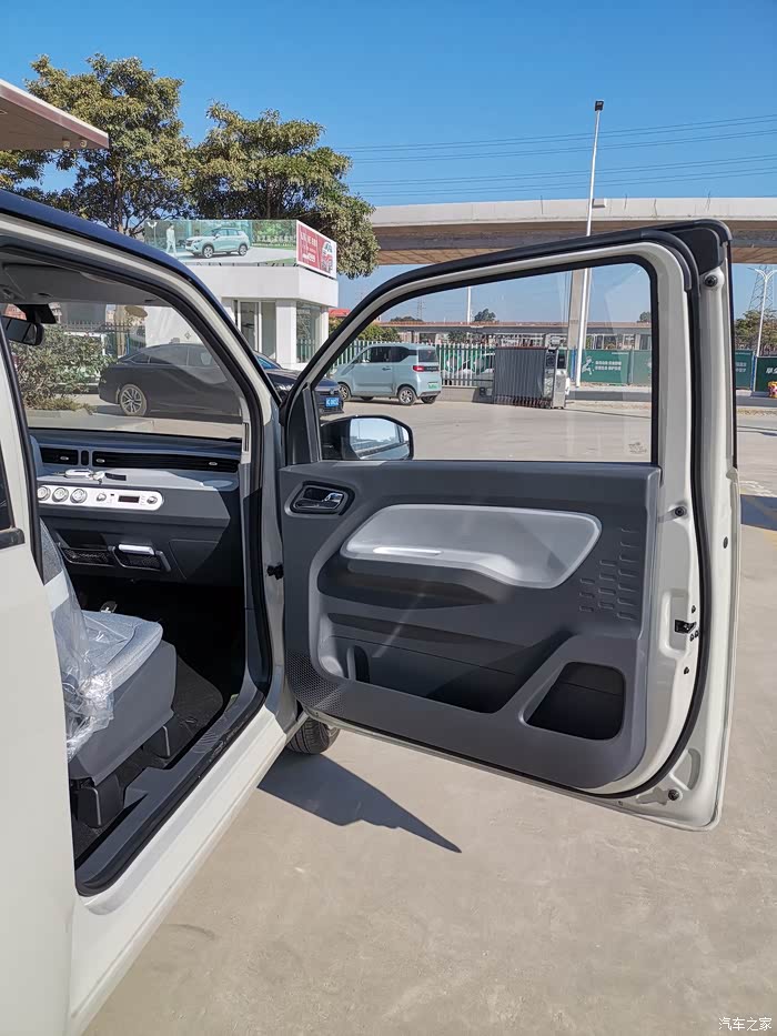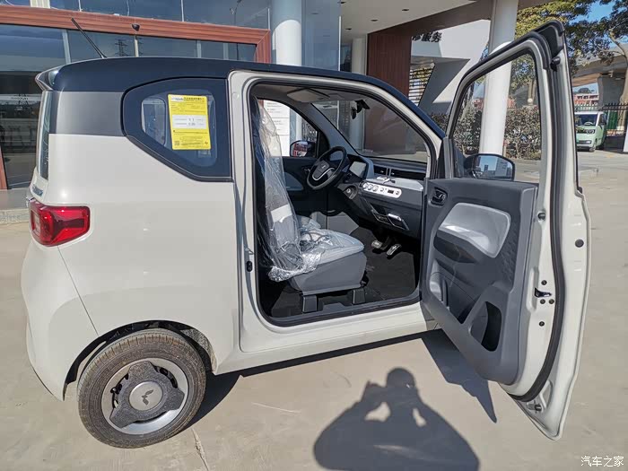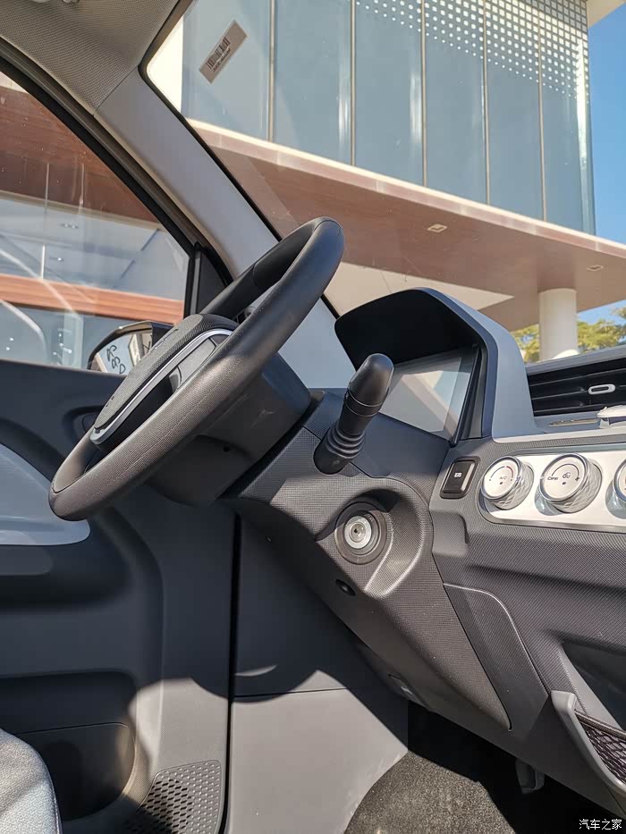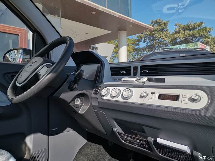 宏光MINI EV的设计以实用为主,中控部分也是简单的空调控制、音频控制旋钮。该车方向盘前方则是一块液晶仪表,方向盘采用简单的双辐设计。