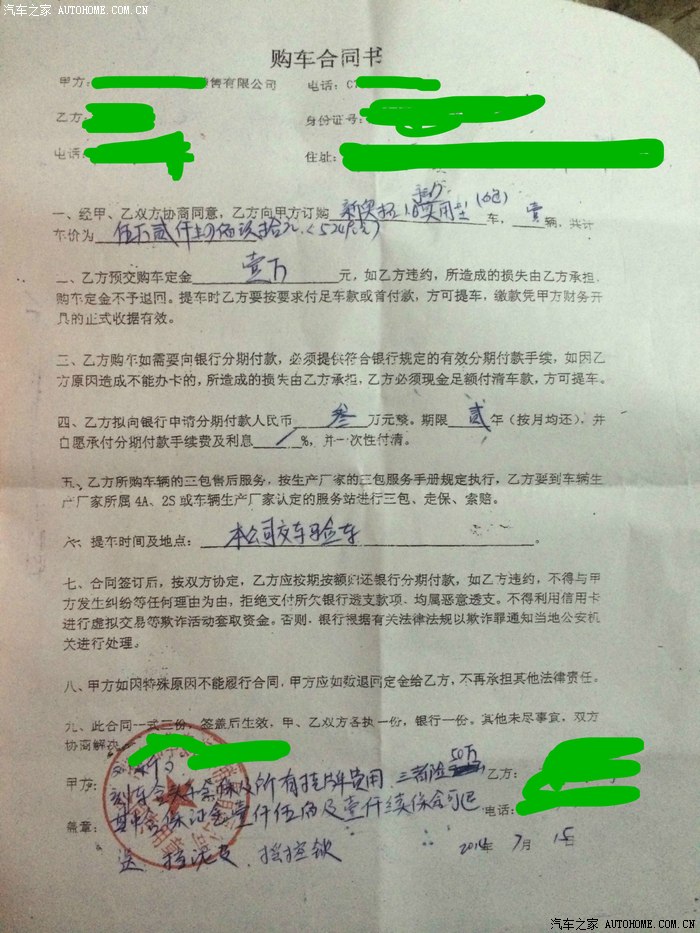 其乱七八糟的费用令人发指~我也是购车心切乱被忽悠了~第二天马上说要改合同,刷信用卡全款买裸车。。。结果告诉我说已经打了定金给厂家,但是一个月内可能到不了。 他姥姥的!!