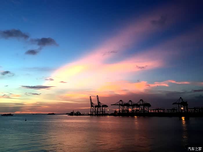 从海口出发时已经是晚上,站在轮渡甲板上观海上彩霞满天