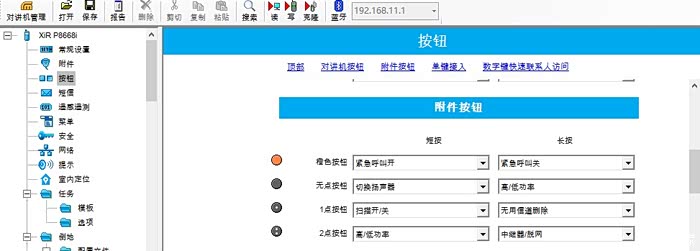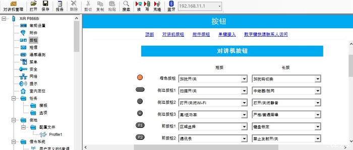 - “XiR P8668i”->“按钮”->右侧上方点击“对讲机按钮”或者“附件按钮”,通过下拉列表即可设置各按钮短按和长按式的功能