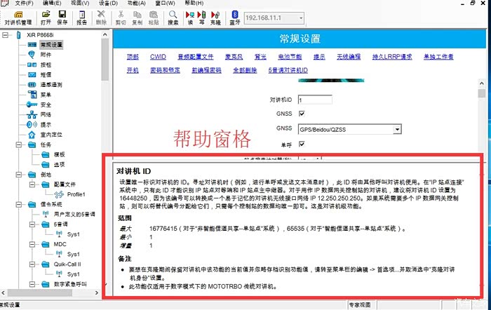 - “XiR P8668i”->“常规设置”->右侧上方点击“顶部”->“对讲机ID”,填写你自己的对讲机ID,写入对讲机即可