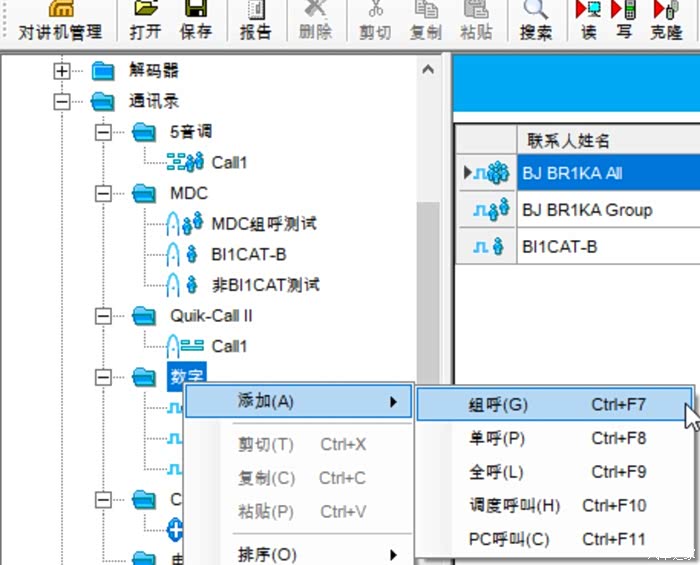 - “XiRP8668i”->“通讯录”->“MDC”->鼠标右键->“添加”->“全呼”/“组呼”/“单呼”