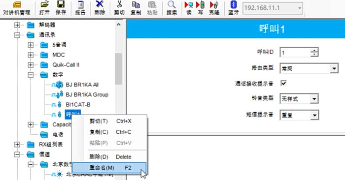 - “XiRP8668i”->“通讯录”->“数字”->鼠标右键->“添加”->“全呼”/“组呼”/“单呼”