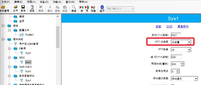 - CPS中,“信令系统”->“MDC”->“Sys1”->组ID(十六进制),设定本对讲机所属的组ID与对讲机A的组ID一致