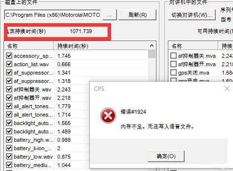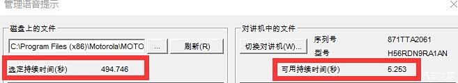 * 注意:由于对讲机存储空间有限(总共可存500秒语音文件),软件会提示你选择的语音文件总时长(秒),以及对讲机上还剩余多少可用时长(秒)