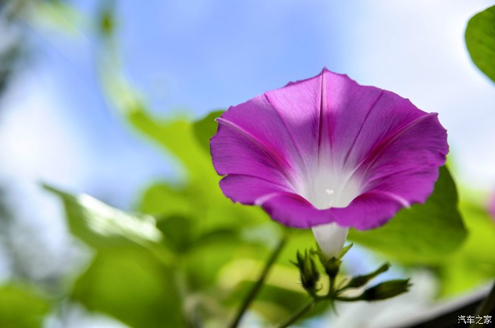 走在一处店的门前看见木桩上绽放的喇叭花!