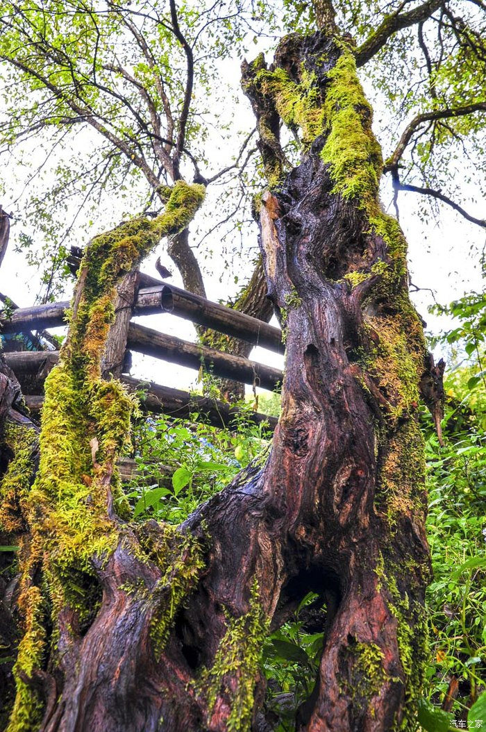 黑鱼河景区中,布满青苔的老树上的简陋的观景台!