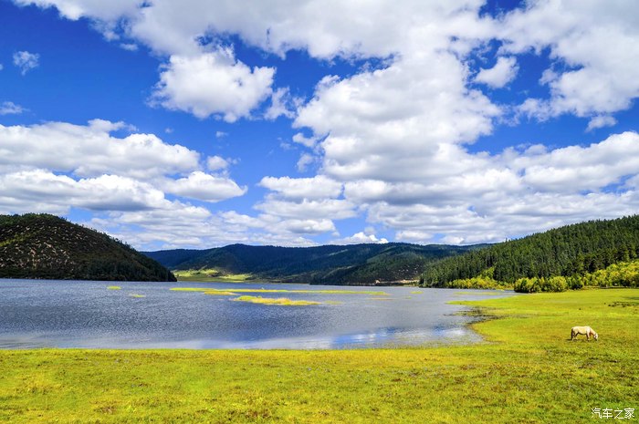 在天高云淡的天空下,拍摄一张全景下的普达措。在绿树成荫的群山之间,清澈的湖水。