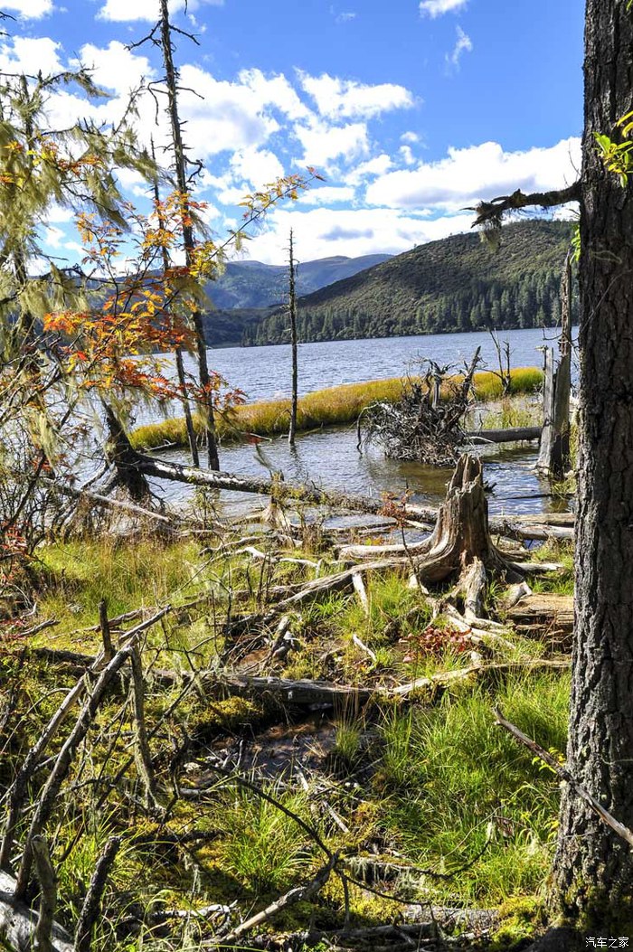 普达措的岸面上、湖中乱七八糟的躺放着腐朽的木杆、木枝、木桩,向我们展示了什么是“凌乱美”。