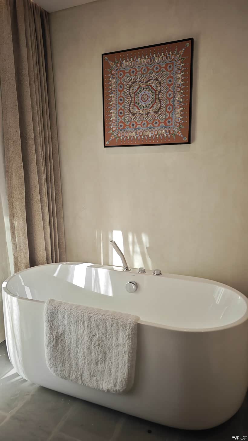 每间客房都有超大浴缸,也有单独淋浴房和智能马桶,全屋都是智能家居,灯光、窗帘、空调、地暖、电视都能通过小度控制。