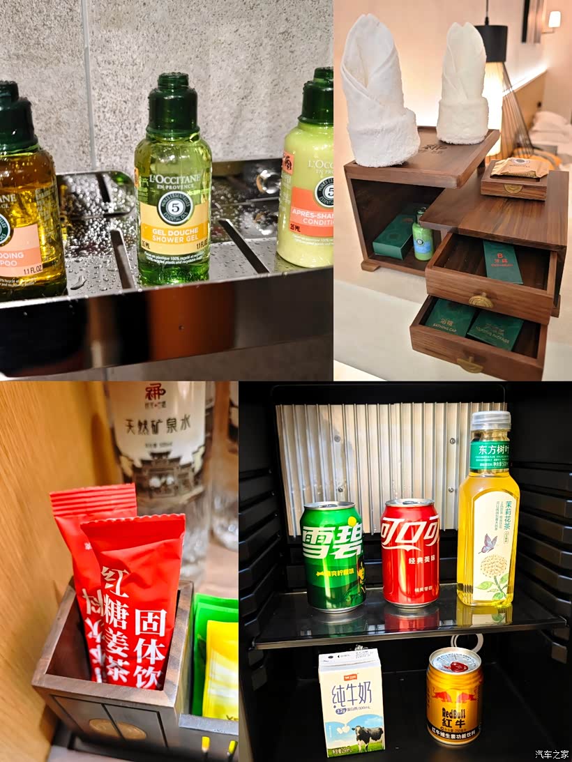 酒店的洗护用品用的是欧舒丹,够档次!因为知道大家必泡温泉,所以还贴心地提供了红糖姜茶包。冰箱内也有各类饮料可免费享用。