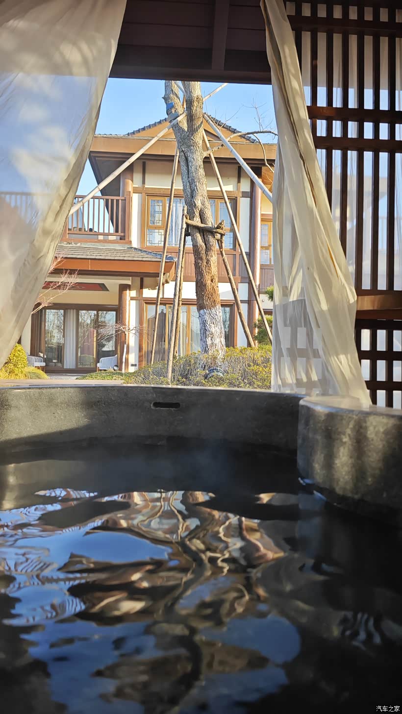方形泡池整体像一座唐风亭子,亭子四周挂着纱帘。清晨睡醒后闲来无事索性换上泳衣来庭院内的温泉池泡泡,看着清晨的阳光透过木隔栅和纱帘照进来,温泉水的热气在阳光下氤氲升腾,朦胧中带着古朴的意境,瞬间有种“此中有真意,欲辨已忘言”之感。