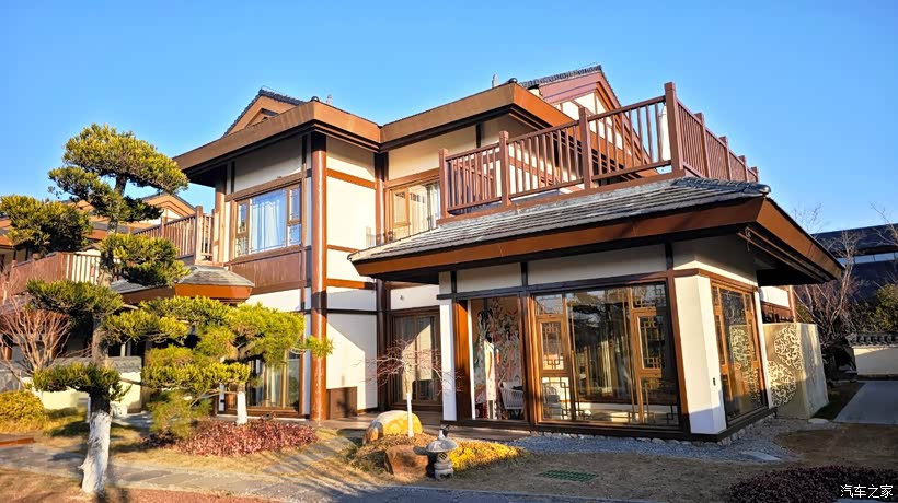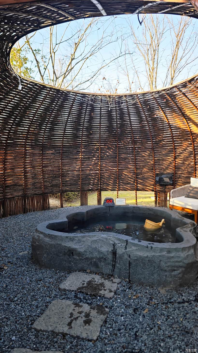 比如我们别墅庭院里就有2个独立温泉汤屋,造型一方一圆,很有设计感。