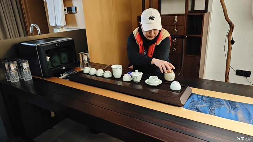 中式的茶桌上有全套茶具和消毒柜,辣哥一来就看上了这个茶台,立即坐上去开始烧水泡茶