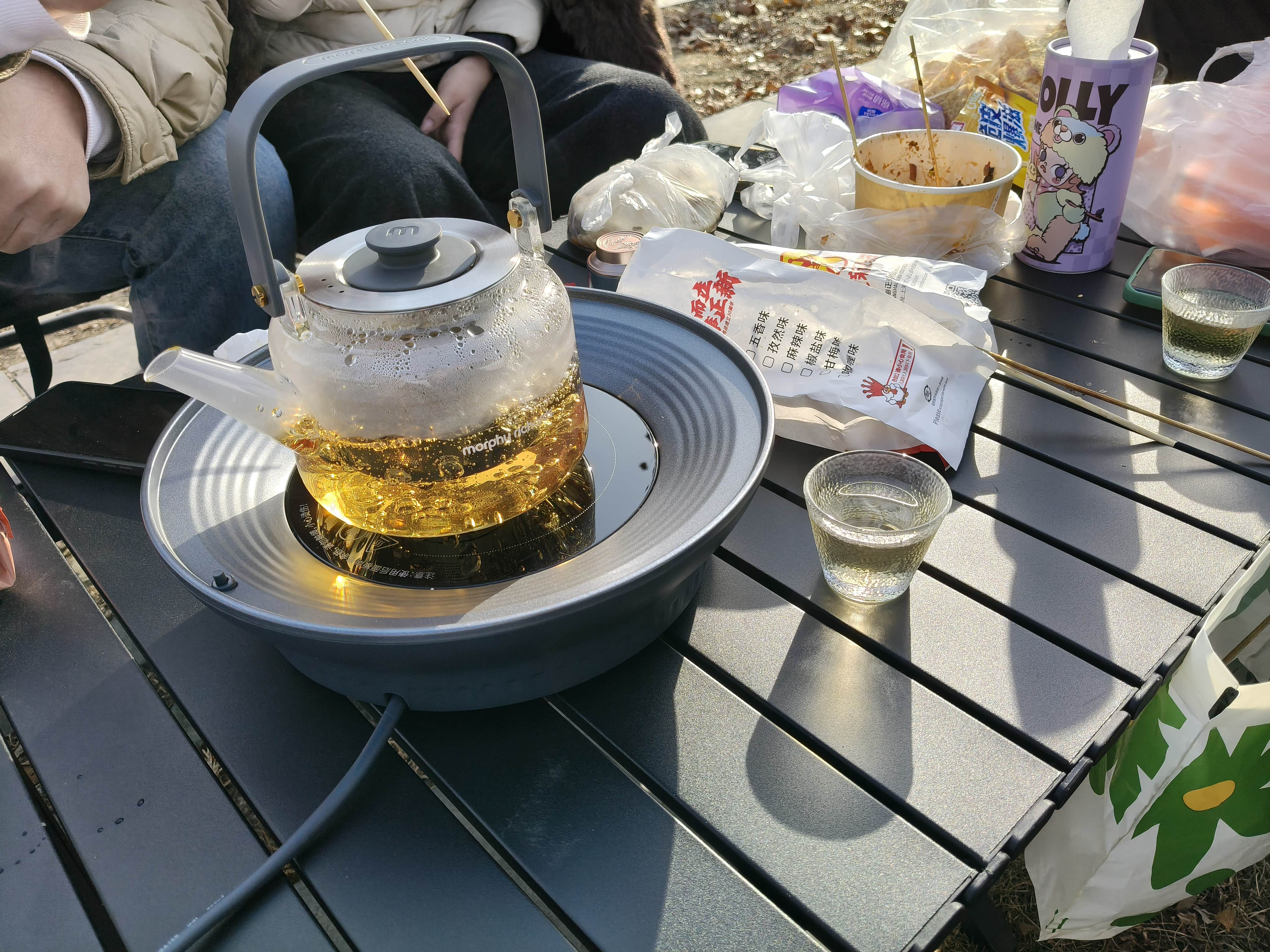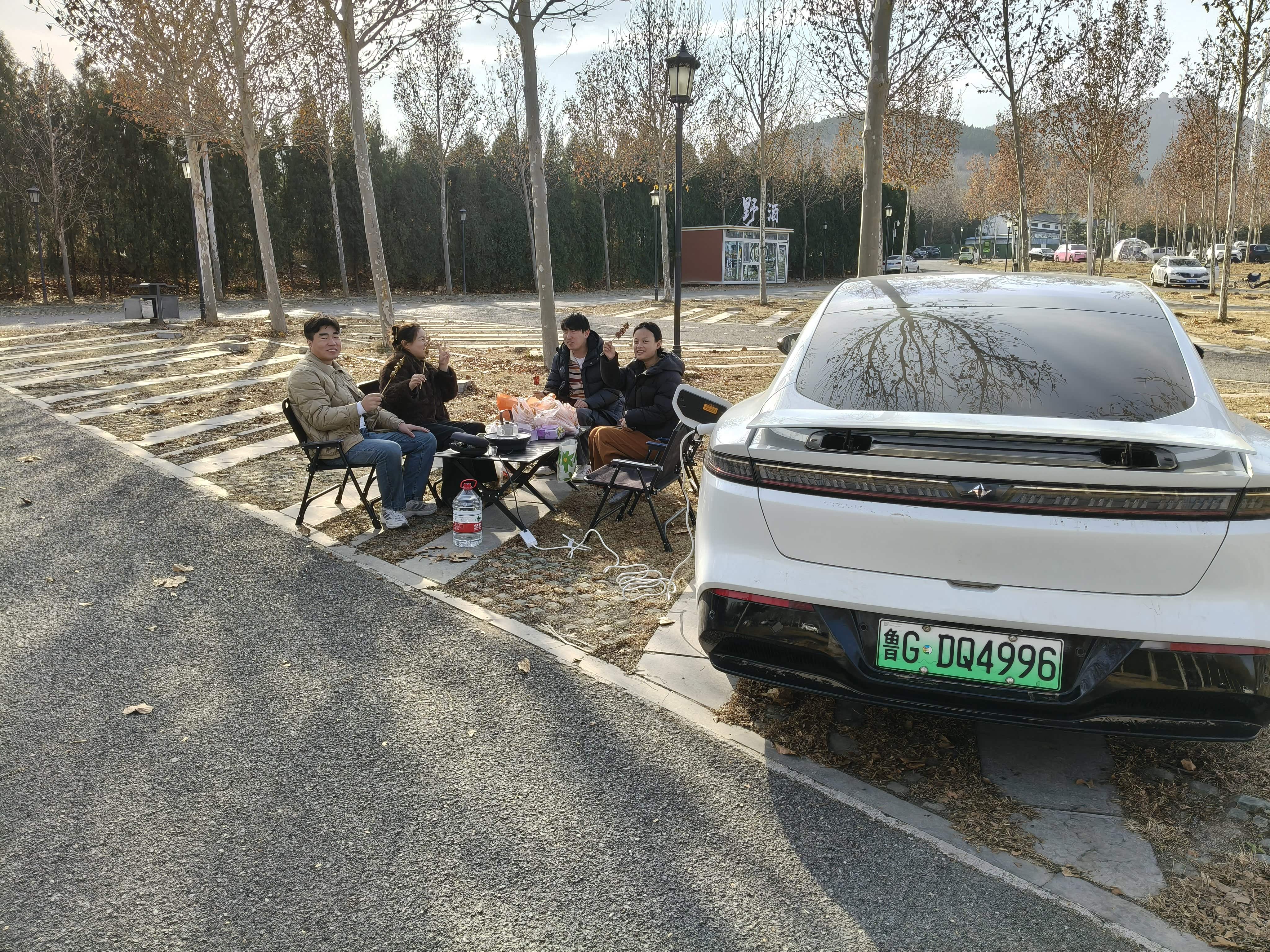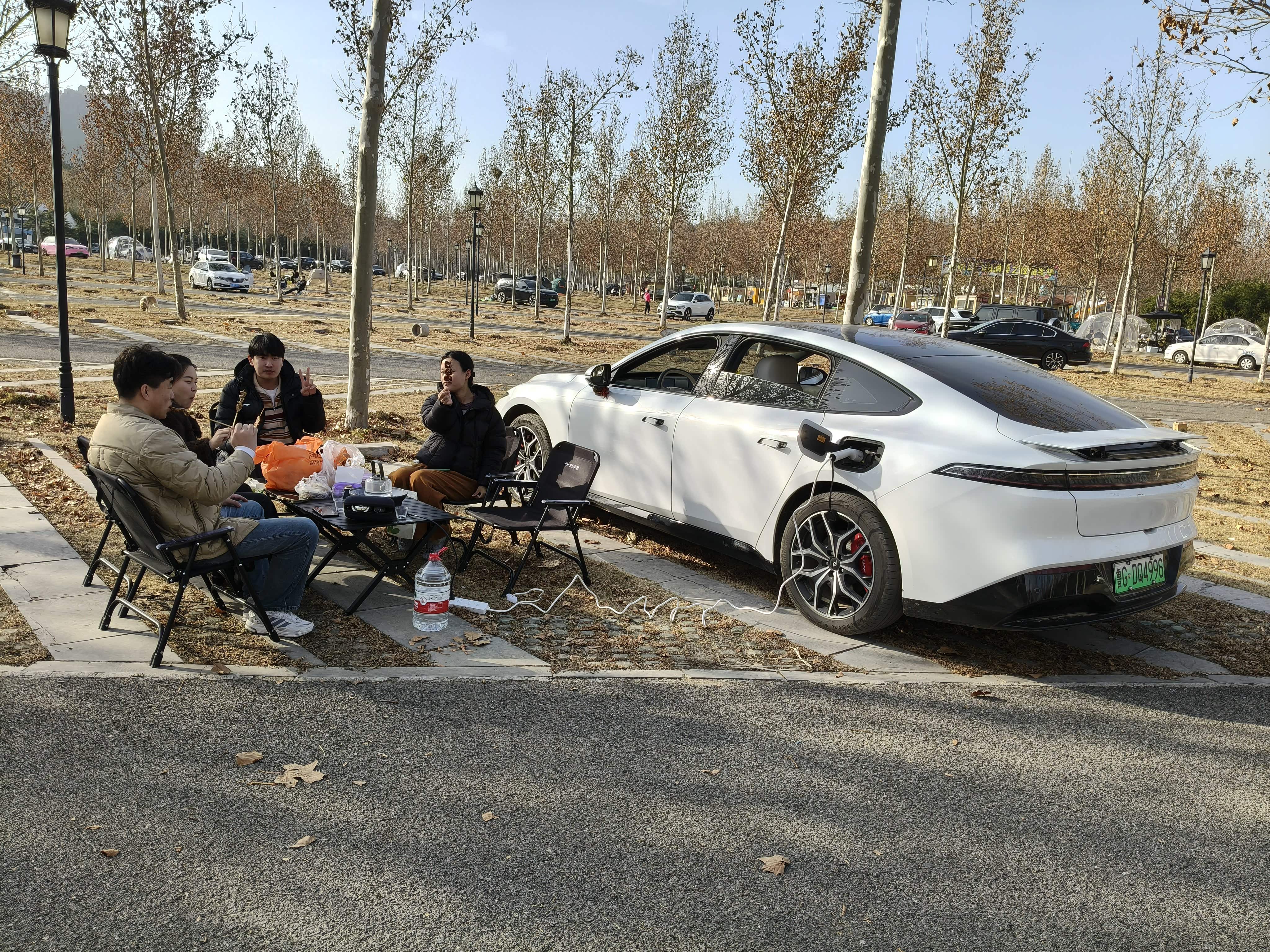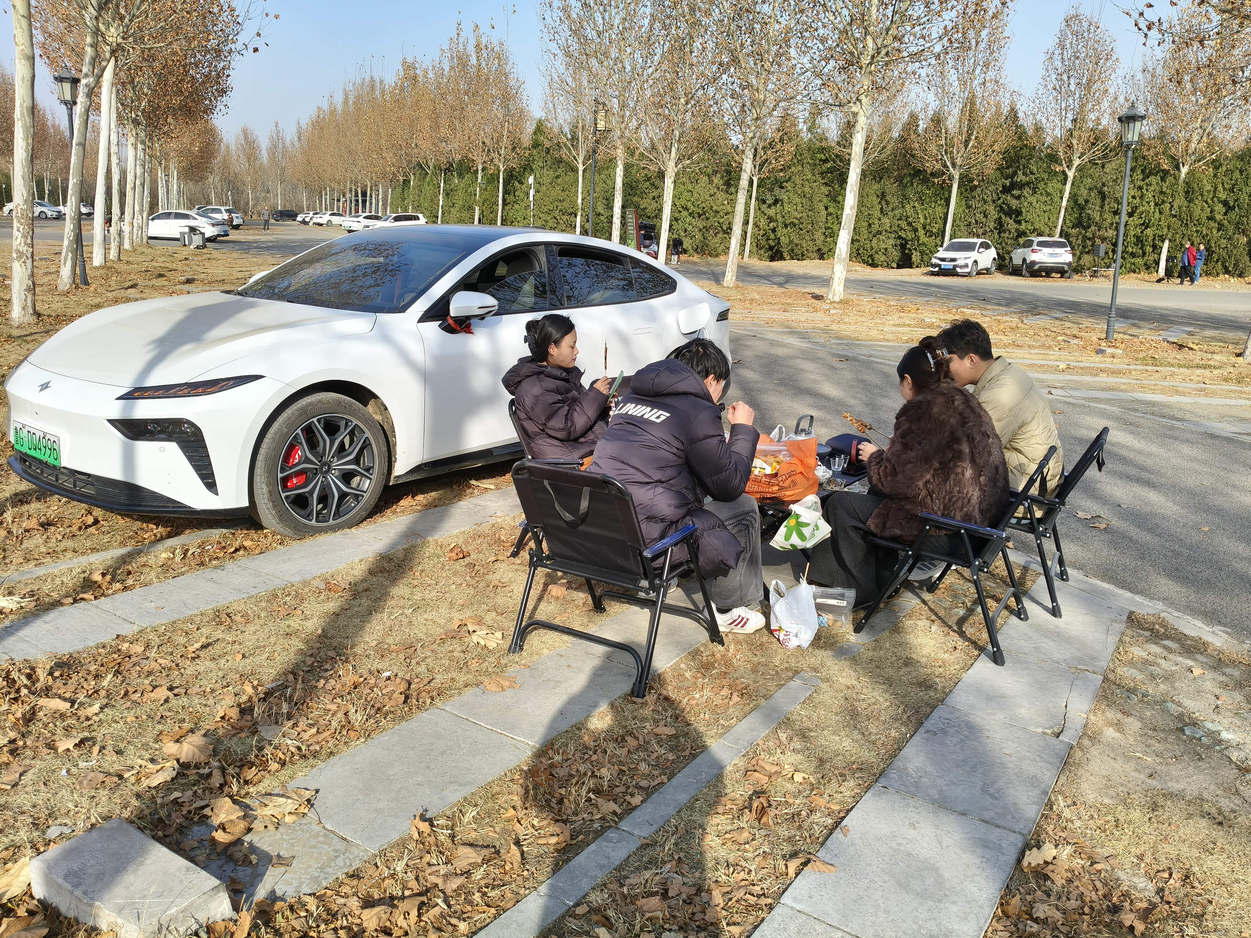 我们把装备带好,开车到露营的地方,刚停下车的时候还刮风,把装备拿出来的时候风停了,天气很懂我哦!我妹妹说这折叠椅质量真好,我把车的外放音乐打开,把桌子撑开,放电插排插好,煮茶器泡好陈皮煮上,吃的摆好,坐在椅子上吃着东西,喝着茶,听着音乐,那叫一个舒服!他们说只是这一刻,东风奕派007就值10万了,真的提供了超高的情绪价值,路人看着我们都是投来羡慕的目光。