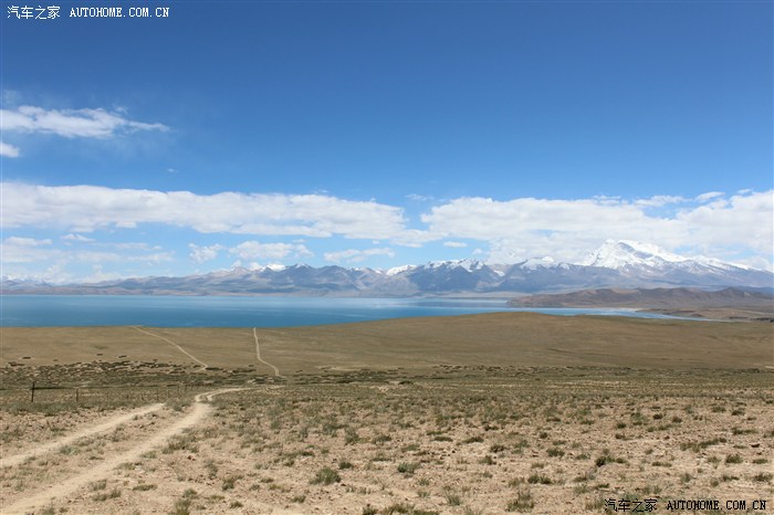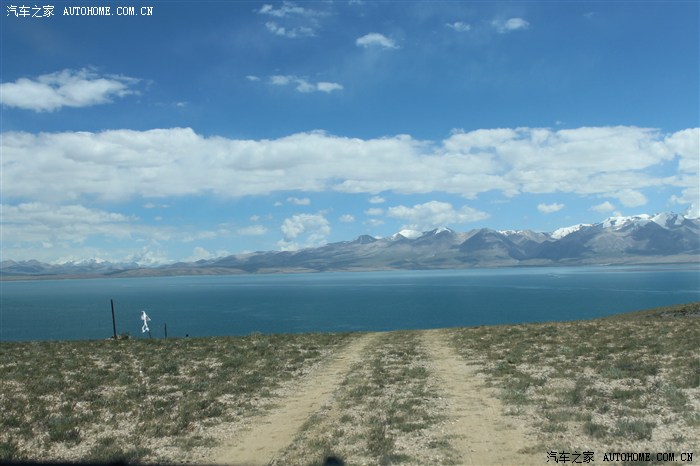 公路左侧有通往圣湖边的越野车的车辙印