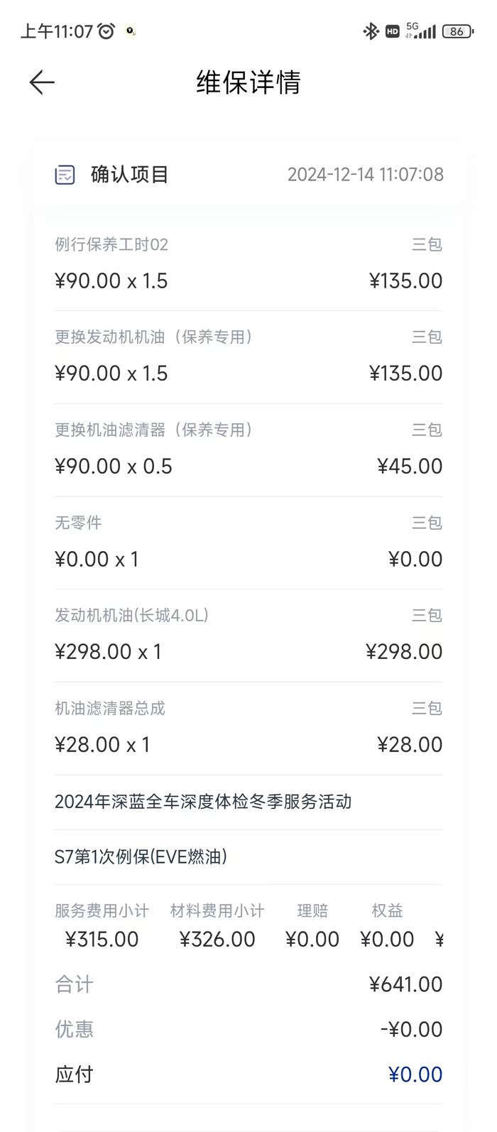 APP上提前就显示应该换机油了,而且厂家最近也打电话让前往任何4S店做一个冬季免费检测,想着反正都是要保养的,所以就一起预约了,流程还是比较简单的,直接在APP上约日期及时间段,约满了的时间段会显示已满,非常直观,根据自己的需求预约就好了,但是有一点,就是预约保养的时间并不准确,到店之后还需要排队,平时应该还好,但尤其是周末,不管是保养,还是洗车排队时间很长,整个保养和洗车过程大概五个小时,不含来回路程时间,原因是深蓝汽车与长安汽车是同样的售后点,长安车型分类广,车型多,因此保养维修的也很多,导致深蓝没有异于其他长安车型的维保体验,除此之外,还有其他一些小问题,后面一一列出。