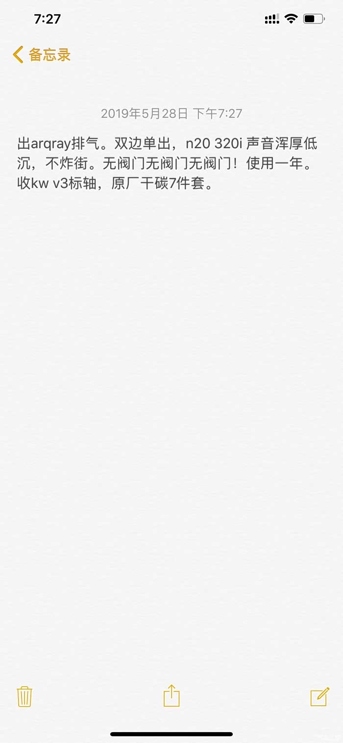 F35 恢复原厂出原厂升级配件※ 内外升级件1.?NBT 10.2屏 旋钮 2.?红色半液晶仪表带HUD接口3.?M3?彩线丁字裤带气囊4.?翻毛皮运动座椅一套 (需要置换)5.?仪表台Nappa真皮包覆带HUD孔6.四门饰板Nappa真皮包覆7. 360环视(270 侧视)一套8.?MP?原厂尾灯?套带线(老款必备)9.M4?橘红马鞍扶手(M4原车)10.原厂湿碳档把 11.四门拉丝银开关※ 性能升级件1. FDE头段?2. IPE中尾段带阀门 N20?3. bilstein B16?绞牙避震4.?stop tech STR60卡钳?355原装盘5. HR防倾杆6.BBS?...