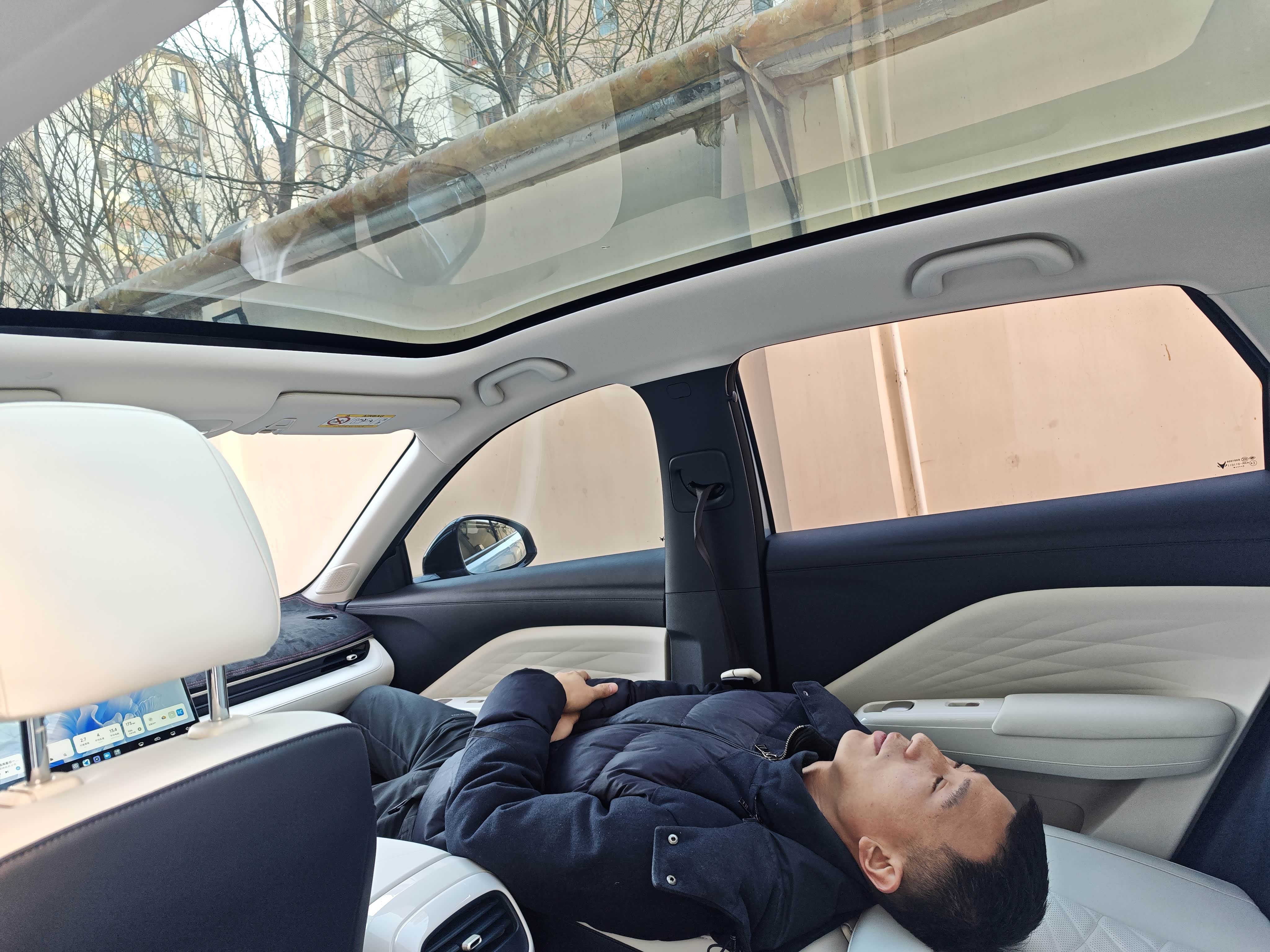 午后的阳光透过全景天幕洒进来,我给他演示了一键放平座椅。躺下来看着天空,他突然问:“这车还有什么隐藏功能?”我打开后备箱盖板,露出74L的隐藏储物格:“充电枪、雨伞、杂物全塞这儿,车里永远清清爽爽。”他探身看了看后排纯平地台:“坐三个人也不挤吧?”