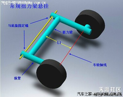 常规扭力梁中扭力梁与车轮轴线有相当的距离L1,这样做其实是让两个轮子在一定的限值内可以独立跳动。再来看它在单边车轮受到地面障碍物的冲击时,扭力梁是如何工作的(说明一下,测试悬挂主要是...