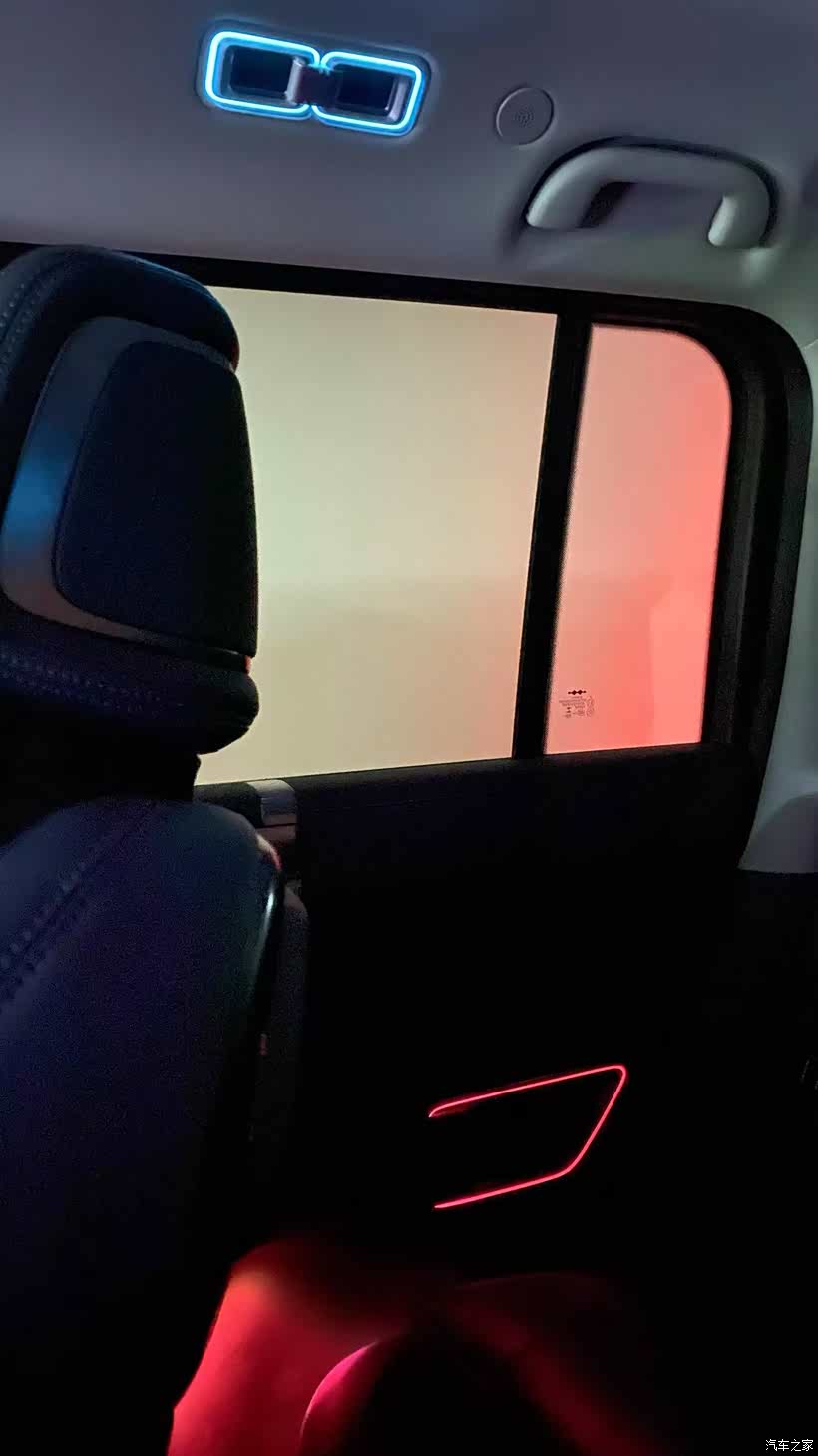 4、氛围灯问题:后排门上方的氛围灯,无法和全车统一,这灯亮起的逻辑居然是和前脸日行灯一致,它明明是个舱内氛围灯啊,实在是割裂,尴尬。见图,上方的灯无论你氛围灯调什么色,它永远是这个色……………………