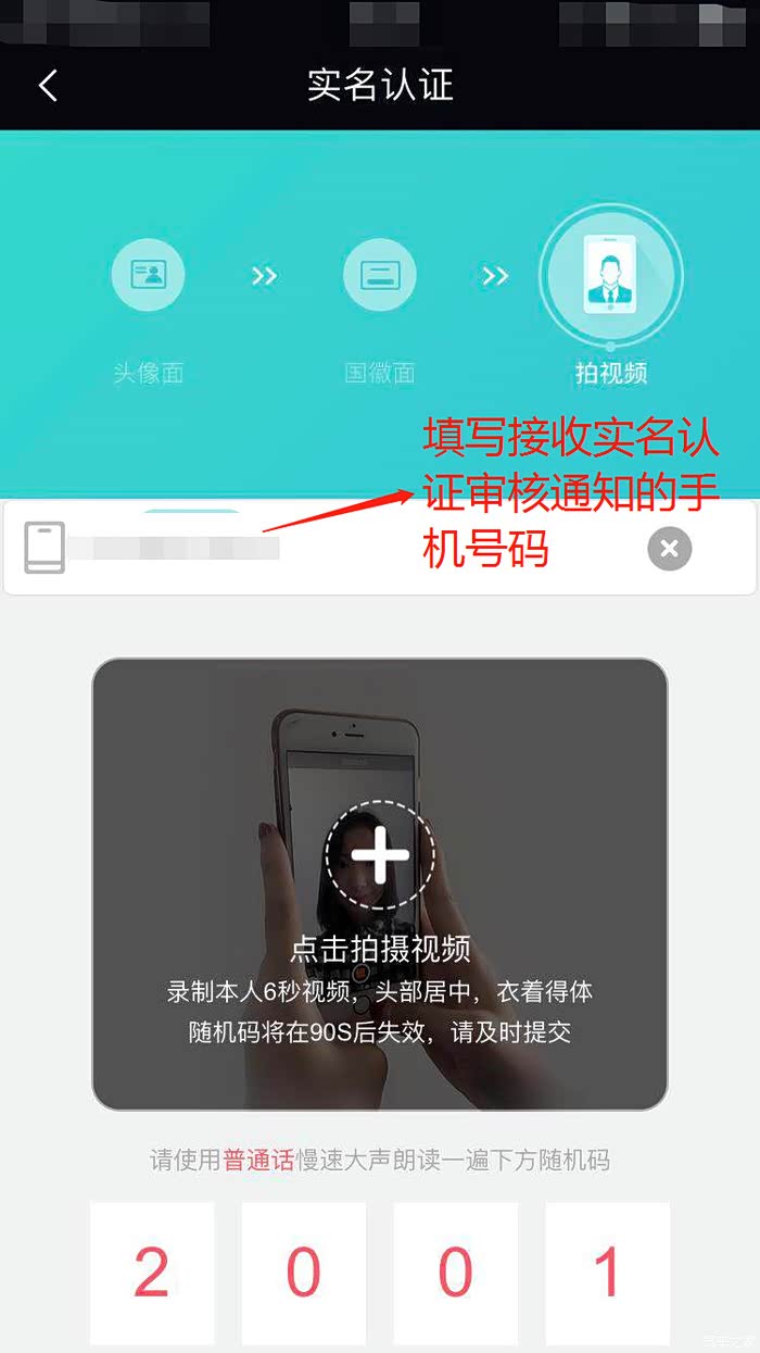 七、填写接收实名认证审核通知的手机号码,然后录制本人使用普通话匀速朗读页面上的随机数字码的视频,提交实名认证平台进行审核(实名认证审核结果会通过短信发送到预留手机号上,审核结果有成功和失败两种状态,审核失败需要重新进行实名认证)