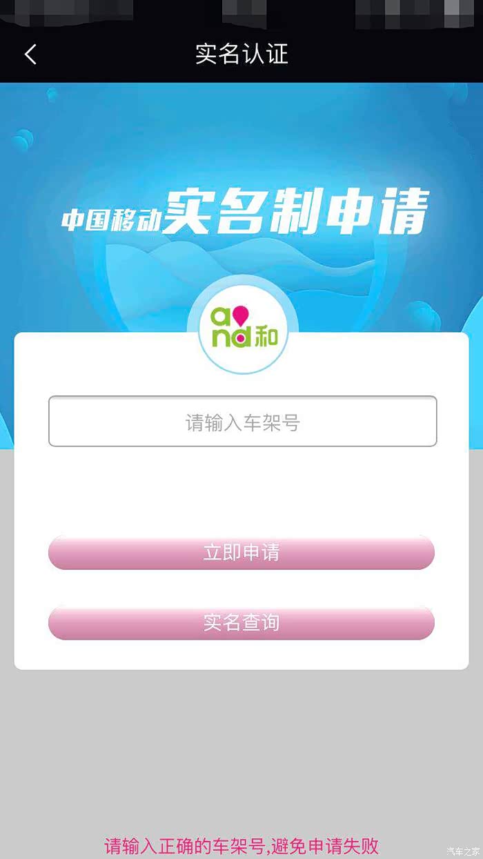 一、先输入三个信息进入实名认证界面,并输入车架号后点立即申请。