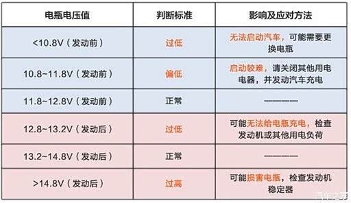一般汽车在不启动发动机的情况下电瓶的电压为12.2V-12.8V。如果低于11.6V时就比较难启动汽车,请尽快关闭其他用电器。当电瓶的电压低于10V时一般就无法启动汽车。