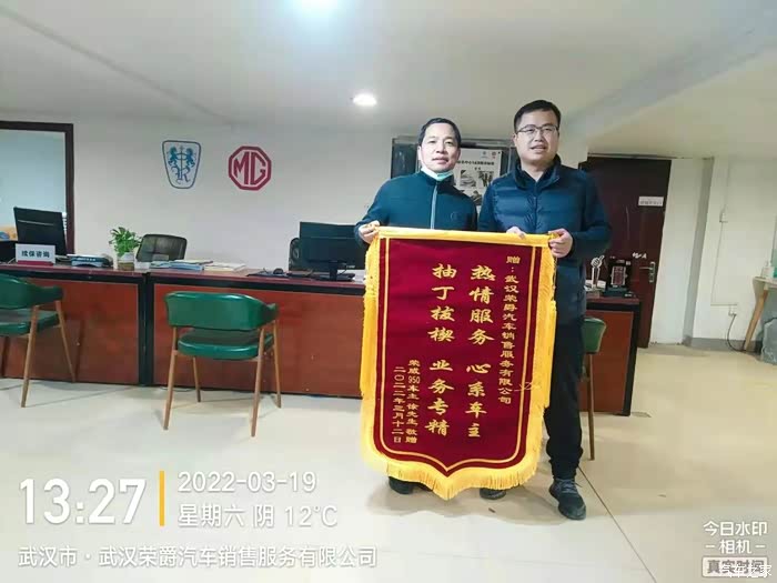 当配件更换后,我迫不及待地进行了试车,当确认其反映的情况已经解决后,我露出了发自内心的笑容。也印证了其当初选择荣威品牌的选择是正确的。为了表示对厂家和武汉荣爵的感谢,我精心制作了锦旗送给武汉荣爵,并在现场表示,以后换车会继续选择荣威品牌。