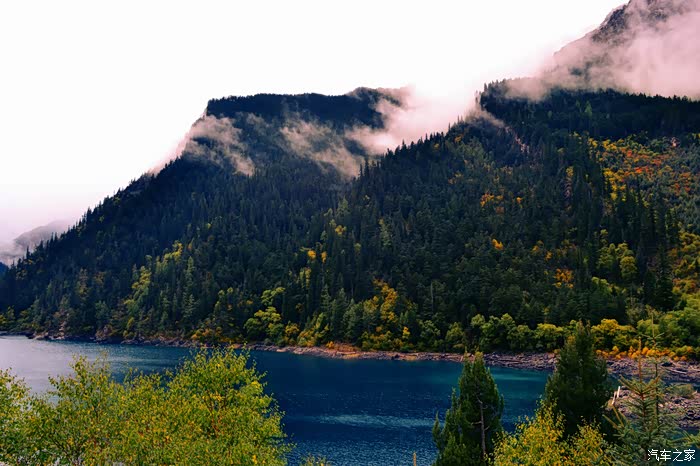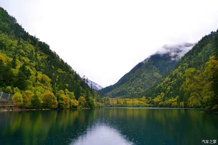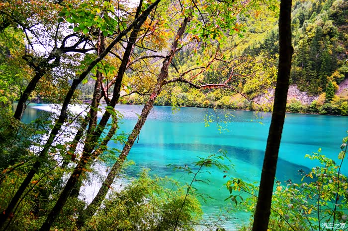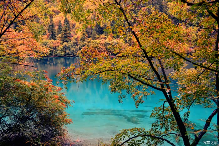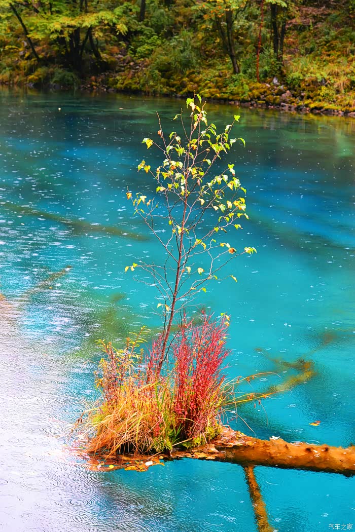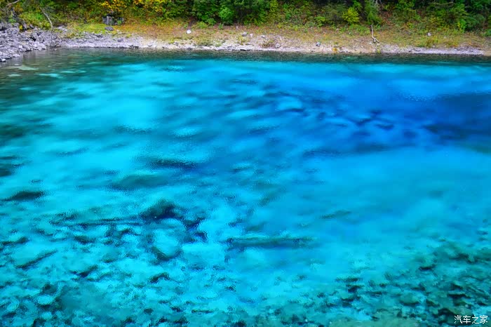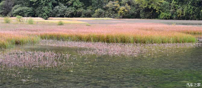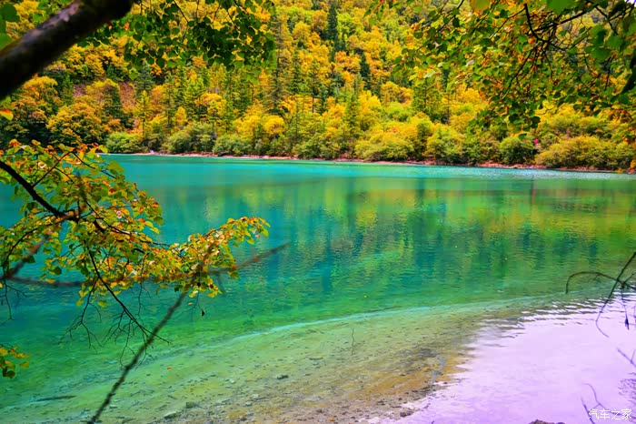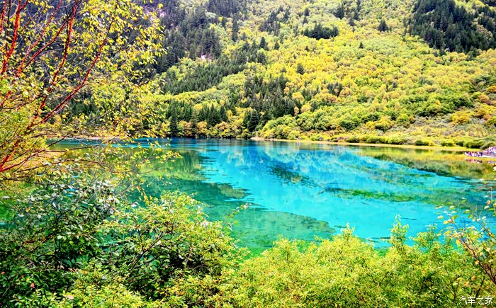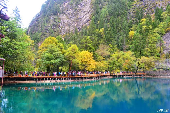 也许是巧合吧,这箭竹海的下一站是熊猫海。箭竹、熊猫想来该是连在一起的,这熊猫海的景致与箭竹海也就有了相似之处。一样的雪山环抱,一样的层林相间,只是色彩更丰富,绿色、黄色中又多了红的映衬,更柔美了。熊猫海的湖水澄澈见底,湖中有嬉戏畅游的鱼儿,湖边岩壁的纹理极为奇特,与湖边水下自然生着几圈黑色花纹的浑圆的貌似熊猫的白石,相映成趣。