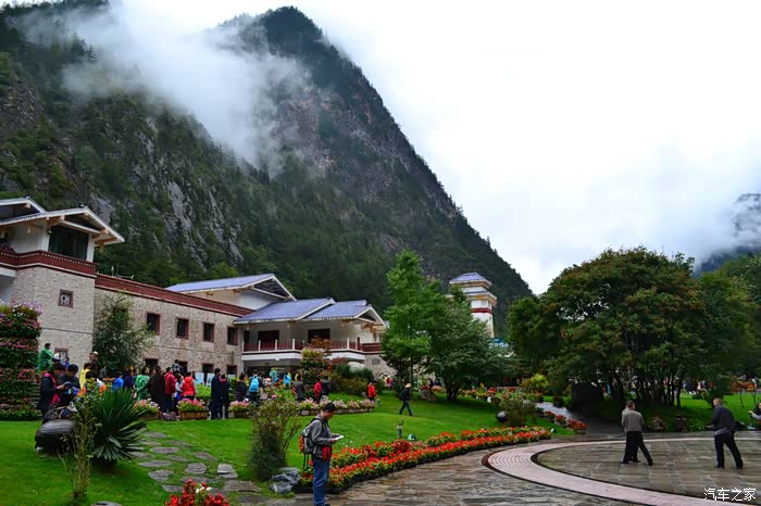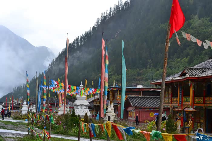7:30出发,雨仍淅沥沥下着,一行人有点懊恼。车跑了近3小时,到达了九寨沟口藏王宴舞酒店旁边。
