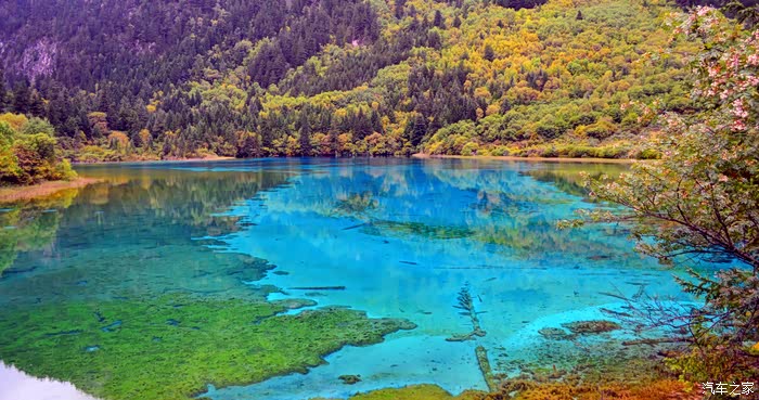 五彩池:九寨沟湖泊中的精粹,上半部呈碧蓝色,下半部则呈橙红色,左边呈天蓝色,右边则呈橄榄绿色。