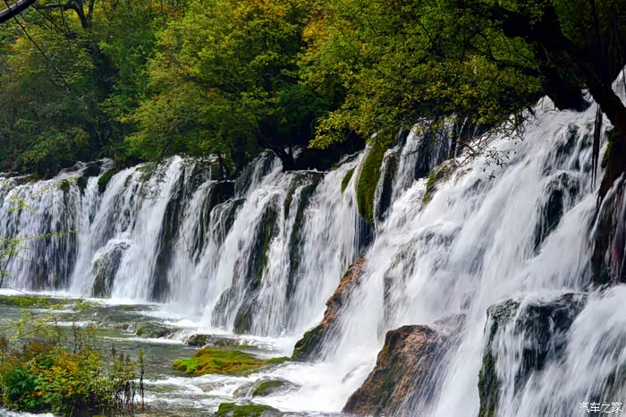 告别令人叹为观止的五花海,前行1100米,经过小、大金铃海,到达珍珠滩。珍珠滩位于日则沟和树正沟的交界处,在一片坡度平缓,长满了各种灌木丛的浅滩处,长约100米的水流急速冲击而过,经过多级跌落谷底,溅起一层层细细密密的小花,宛若撒落一地的洁白珍珠,这便是《西游记》中的仙境——珍珠滩了。