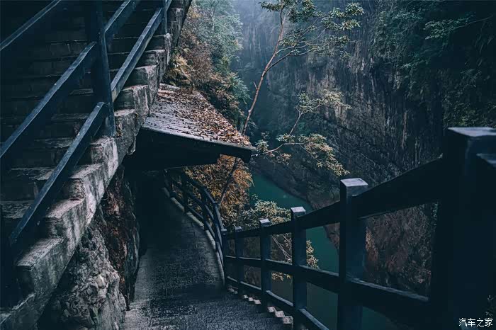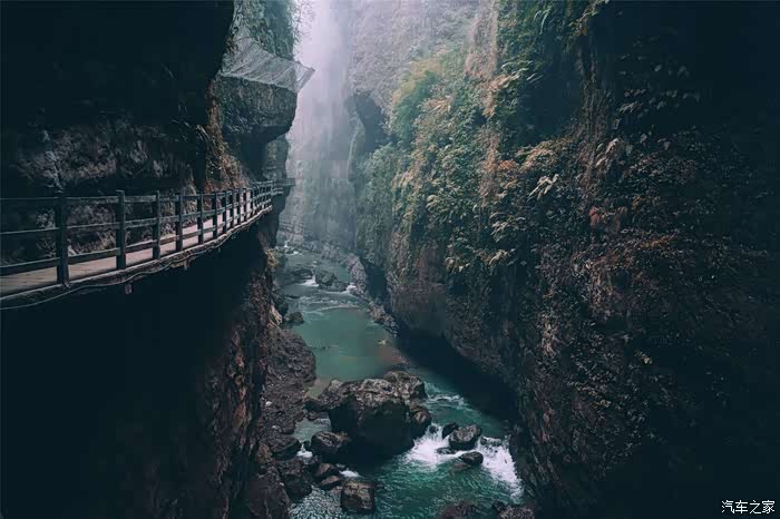 经过那座融入了许多土家文化元素的云龙桥,沿着山势向下的阶梯,我们一步步深入到地缝中去。大约下了百多步石阶,一条秀美的河道呈现在眼前,那水,纯净得比土家幺妹儿都还要纯净,洒脱而天真地流着,无拘无束的,让人实在不忍心去打搅它。
