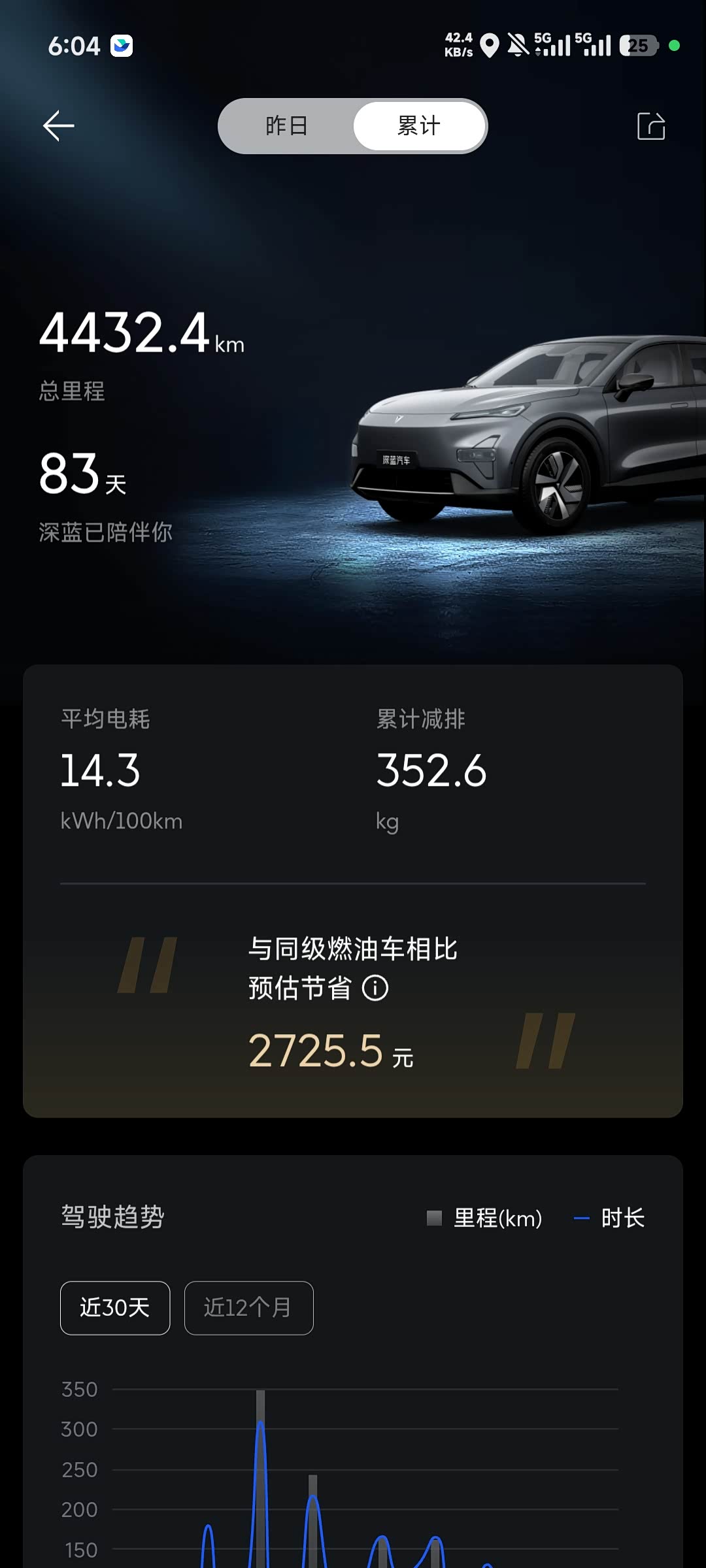 提车也两个月了,也开着深蓝s05驶过了四千多公里,也算一个不高不低的数字吧。那就来讲一下提车到现在的使用体验吧,首先这个车子我是用来上班通勤的,在行驶里程中有一大半都是高速路段,而且我驾驶得还算激烈,基本不考虑电耗,能盯着限速开绝不少一点的,能开120绝不开110,在这样的驾驶情况下,综合电耗目前去到了百公里电耗14点左右,我个人来说是相当满意了,而且高速领航辅助功能也为我的通勤体验提供了很大的助力,目前来说只要不是施工路段或者线磨损的特别厉害的情况下,深蓝S05的表现都是可圈可点的。然后舒适度这块,座椅通风座椅加热,电动调节座椅,上下车座椅自动调节这些看似不起眼的功能,在体验上却是实打实的提升,属于细节中提升。车身降噪的话低速行驶的情况下是不太听得到噪音的,在高速开的时候胎噪风噪就会比较明显,毕竟是无边框车门,有舍才有得嘛,音乐开大一点就听不到了,对我这种上车就自动开启播放音乐的人来说完全不受影响(仅个人感受哈),然后深蓝的充电体验目前来说也是不错的,说的3c功率,但作为稍显过时的400伏平台架构来说,目前市面上能跑满这个功率的充电桩还是比较少的,目前试过的就理想超充桩。还有蔚来的充桩能跑到一百六十千瓦每小时的功率,小鹏的桩我的城市没有,还没试过,普通的快充桩一般充电模块限制电流在250安左右就上不去了,综合也能达到一百千瓦每小时,算上末端衰减的充电速度,差不多在四十多分钟就能充满,这个速度还是可以的。