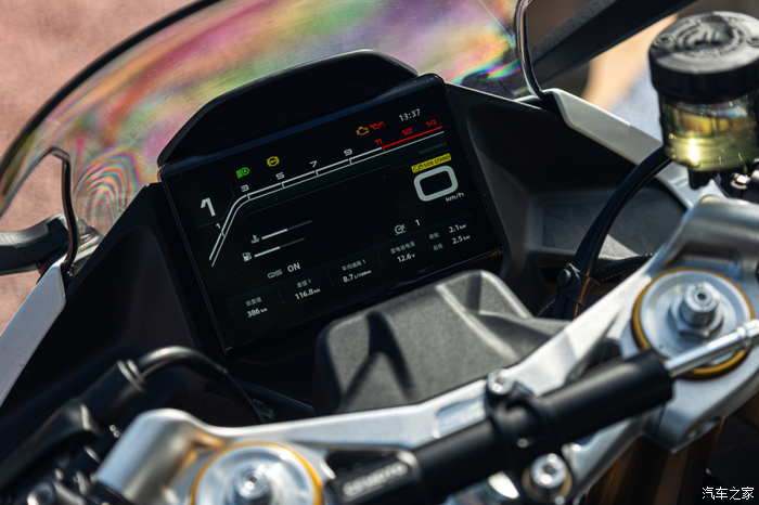 整车除了搭载全LED灯具以外还拥有一款仿赛中最大6.2寸TFT全彩液晶仪表。该仪表在功能和UI上也非常出色,并且还自带光感功能,显示上拥有MotoPlay、节日彩蛋、Wi-Fi、寻车防盗、救援服务、倾角显示、胎压监测等功能。而且750SR-S除了传统钥匙以外还支持NFC、蓝牙、密码、APP数字钥匙解锁,并且龙头、油箱、坐垫电子锁三者合一以增加便利性。