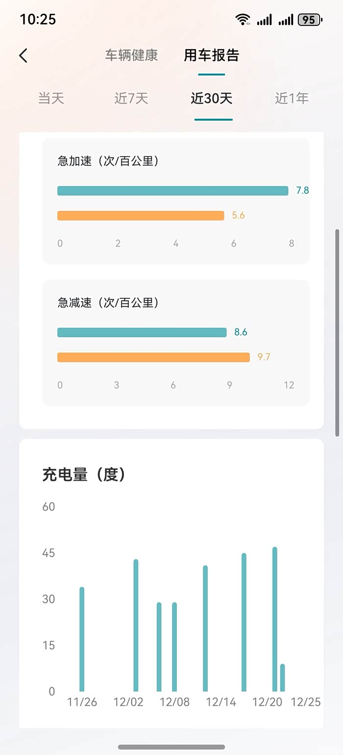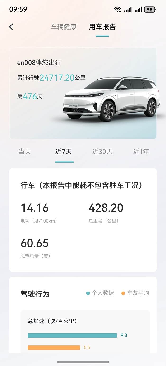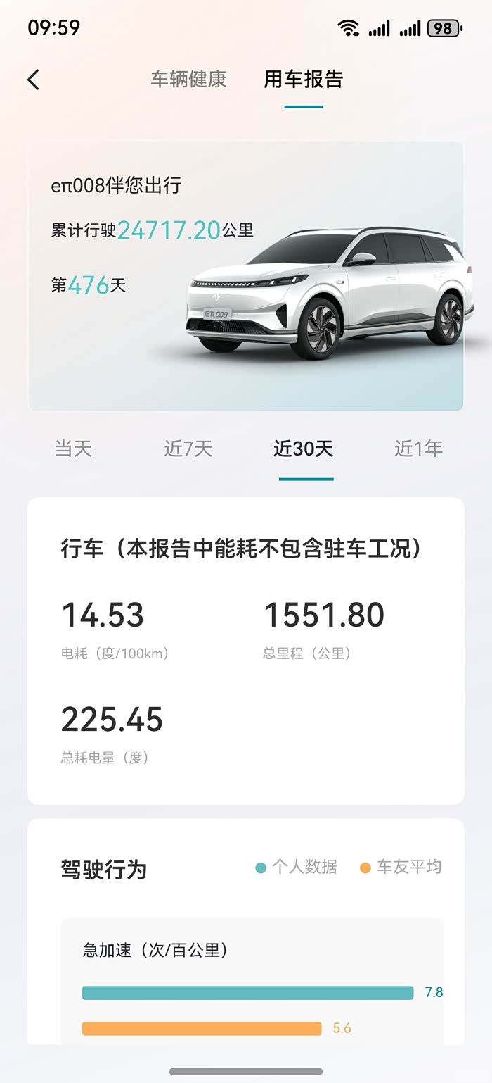 当然能耗和平时的驾驶习惯有较大关系,我近一个月的急加速大于了平均水平,急减速小于平均水平,所以如果均能小于平均水平,相信能耗还能进一步下降。