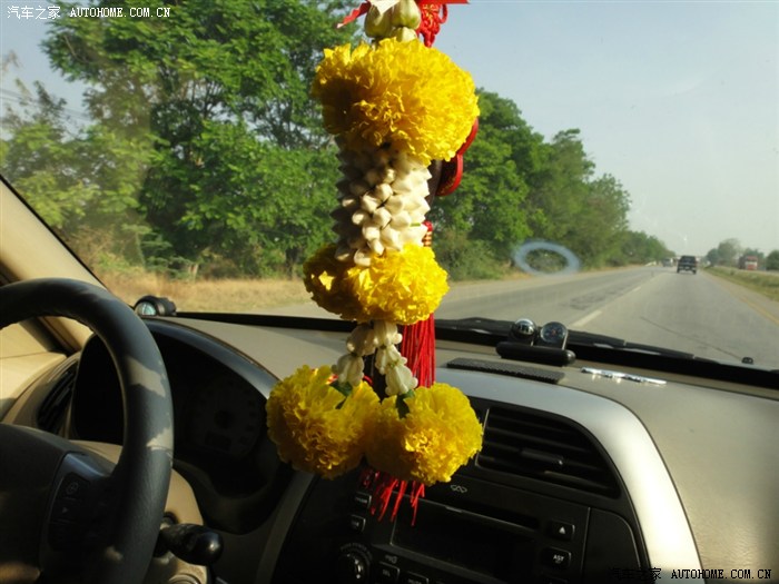 看到泰国的车喜欢挂鲜花做的挂件,我们也买了一个挂上。