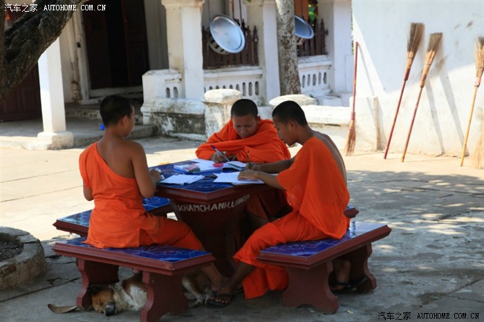 当地的风俗是男孩子一定要当一段时间和尚,在寺庙里受教育,象服兵役一样。小和尚在学习。