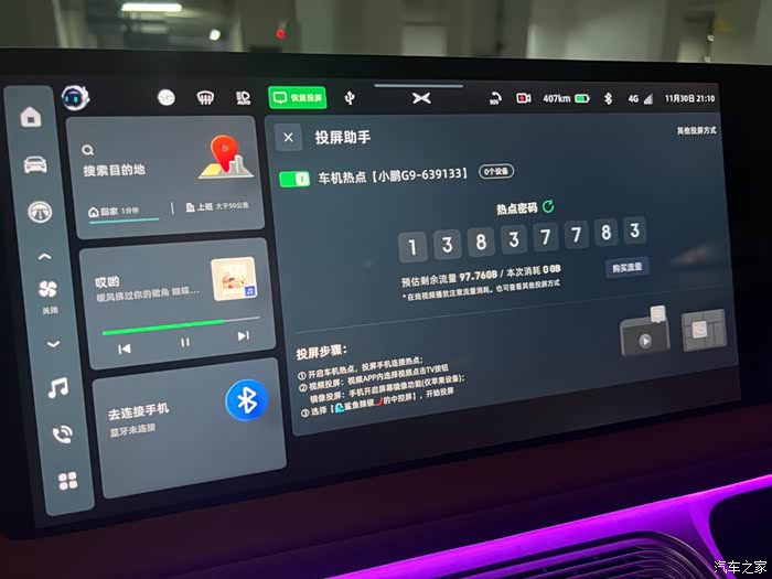 这是我觉得这次新增的除了辅助驾驶以外最实用的一个功能了,因为小鹏的车机目前不支持浏览器,所以你想看网页的话,现在是没有办法的,有了无线投屏功能,你就可以在车机端看你任何想看的内容了,连接方式也非常的简单,通过无线热点连接。并且在你使用完车机之后,还有一个恢复投屏的按钮,这一点很人性化,目前只能支持苹果用户这点体验不够好,希望安卓尽快加入这个功能。