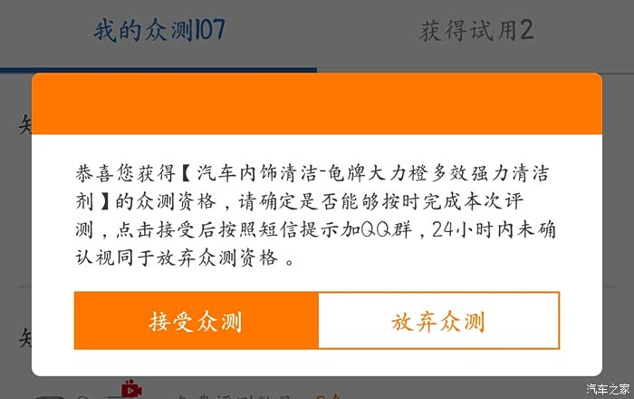我是一名论坛新人,汽车之家用户名:baobaoao,第二次中奖我还是有点激动,希望得到论坛各位大神得指点与提携。我荣幸能获得家家众测汽车内饰清洁-龟牌大力橙多效强力清洁剂的试用资格,这真的是一件令人无比开心的事情,希望家家众测各位领导、各位车友工作顺利,一切安康。
