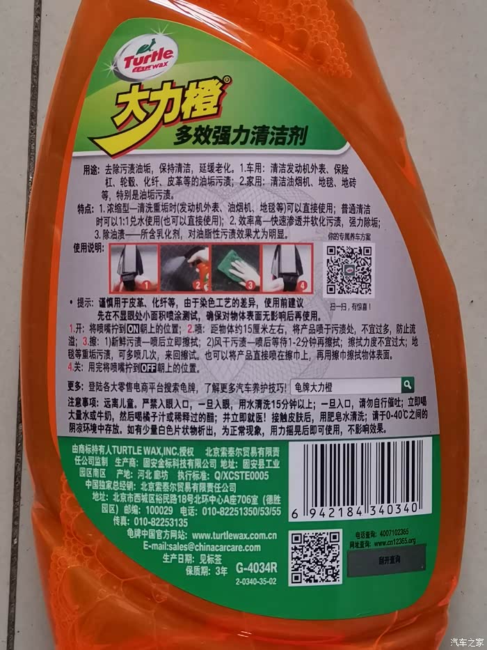 这次参与众测的产品是:汽车内饰清洁-龟牌大力橙多效强力清洁剂很好用,价格很实惠,性价比很高,算是平价好物。龟牌的产品都很好,毕竟是大品牌产品,一直很信赖龟牌这个品牌,我家车用的养护的全都是龟牌的养护品,都很好用。这款龟牌大力橙多效强力清洁剂蛮好用的,包装很严实,没有漏液,看着不错哦;质量很好,洗的很干净,很整洁,简单易操作。清洗皮革非常干净利落,去污能力强。好用不贵,质量也不错,洗得很干净,用来清洗汽车布艺座椅,洗的很干净,对织物座椅的车辆来说太好用了,清洁力超级强。在车内真皮座椅上局部试了试,一喷再干毛巾或海绵一擦,除污能力真的很不错。产品的气味还是有点刺鼻,需要在通风处使用,最好带上口罩。产品的浓度很大,用的时候要适量喷洒,然后打出泡沫,在用布擦洗干净,清洁的效果还是不错了。清活力度强,车身车内都可用,擦轮毂效果很棒,用来清洗百叶窗布带上的污渍也很好用,有一种香香的味道,闻着很舒服,效果非常好,一喷一擦,污渍就没有了,擦车厨房都能用。总体看着不错,包装很好,先看了一下使用说明方法,对于比较容易清除的污渍,感觉还是挺有效果的;然后又试了一下清除油烟,由于我家的油渍时间比较长了,污渍不是很好清理,去污力不是太强,要结合洗涤精混合使用才有效果。喷上后按照要求等待了几分钟再进行擦拭,虽然有一些效果,但跟我的期待还是差一些,也可能是我的问题,过几天再试试,总体还不错。该产品相对其他如威猛等来说气味还好,不刺鼻。总之,这款汽车内饰清洁-龟牌大力橙多效强力清洁剂是一款非常实用的产品。