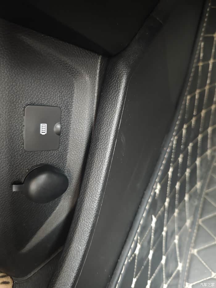 下图是儿童锁拨杆,是在后排的门板上面,如图所示的状态是未启用,如果向内拨杆,代表启用儿童锁,这样关上车门,行驶起来的时候车里面是打不开车门的