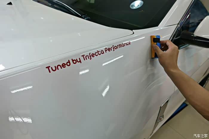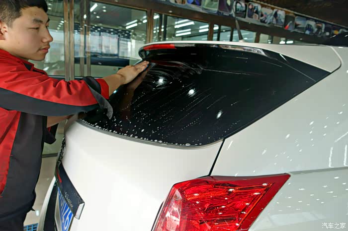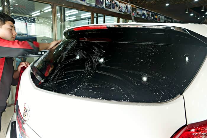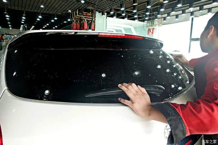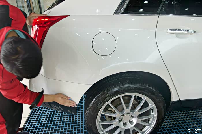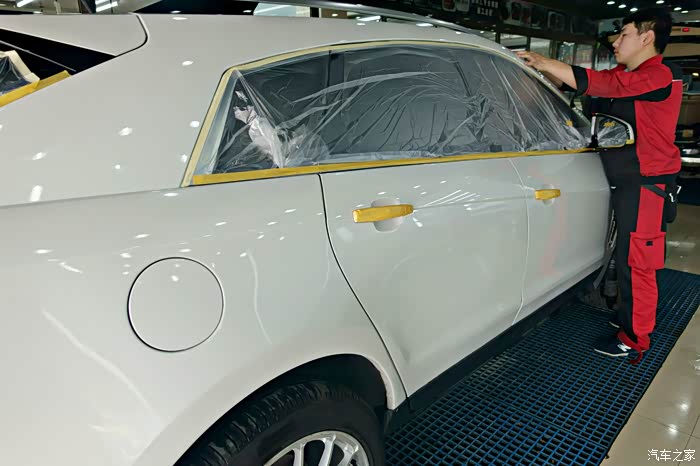 接下来,给大白白仔细贴上保护膜。在玻璃、轮眉、窗边亮条等等地方帖上这层保护膜,是为了防止在高速运转的抛光机工作时造成不必要的伤痕。看了很放心。