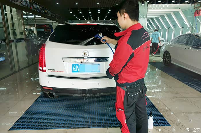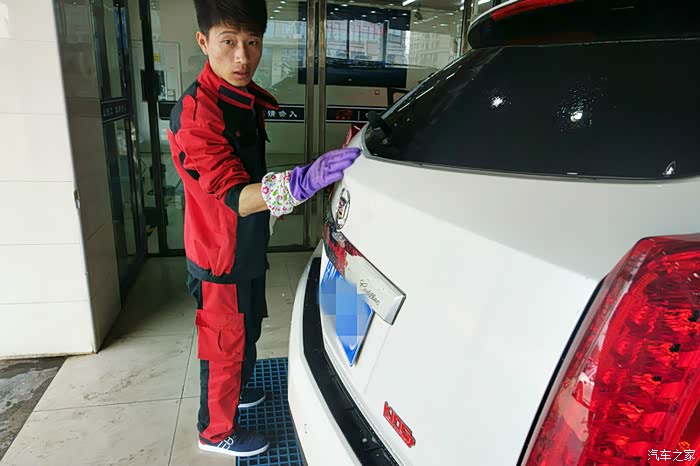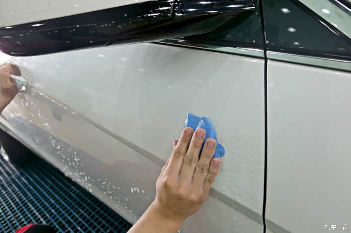 工作人员用手中这块蓝色的泥巴反复擦洗漆面,看着挺好玩。了解了一下这叫洗车泥,是一种擦洗车体的泥巴,它是由超细纤维及固体胶状经过反复密炼而成。 具有细,粘的特点。 细:经洗车工人反复擦洗,可以擦入车体因氧化而产生的细孔,斑状。 粘:经洗车工人反复擦洗,可以粘除车体上的自然氧化、水垢、洗车、鸟(虫)粪便、铁粉、酸雨、树液以及不当护理的残留物质。在不损伤车漆的情况下,可以清除车体的有害残留物质。