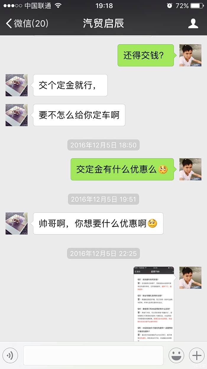 今天去本来签合同的,忘记拿身份证了,我去车里拿回来后,看见销售跑去经理室了,和经理说了半天,也不知道他俩在嘀咕什么,出来后给我说:帅哥不在咱家交定金不能签合同的,别人都5000我给你3000吧,靠,逗我玩呢?我想都没想说:算了吧,明天就上市了,价格出来再说,大不了我那100大洋就当打水漂了呗……