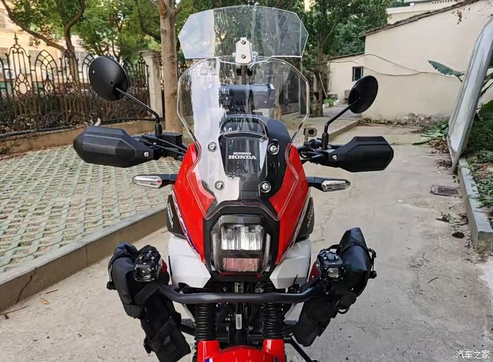 支持可调节的长行程前减震和可调节的中置多连杆后减震也诚意十足,离地间隙上通过北京摩展小编双手测量预计达到230mm左右。前后轮搭载大口径浪花碟刹,并配备双通道ABS+TCS牵引力控制系统,手把上也看到有ABS和TCS系统的独立开启/关闭按键。