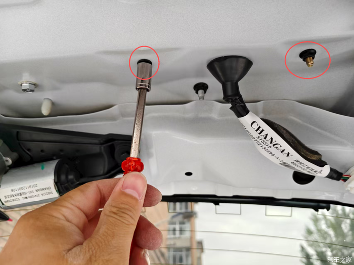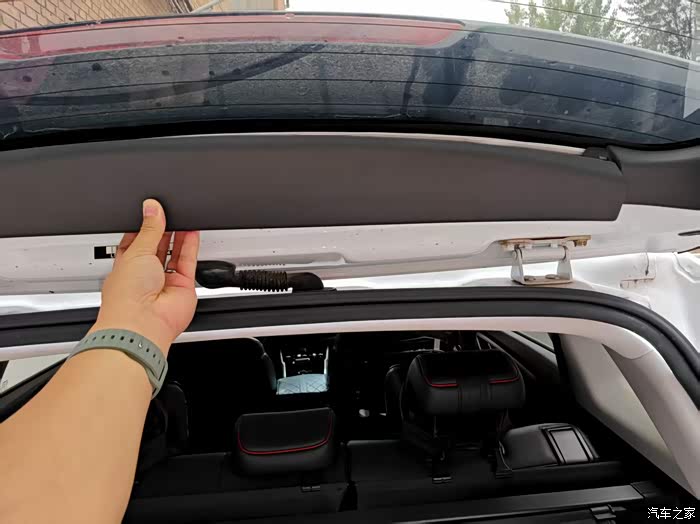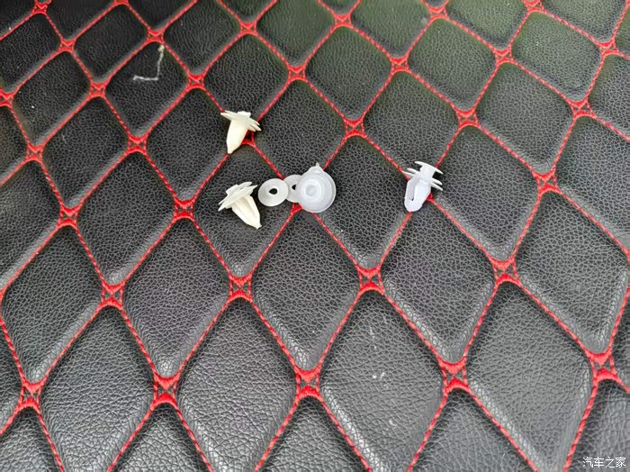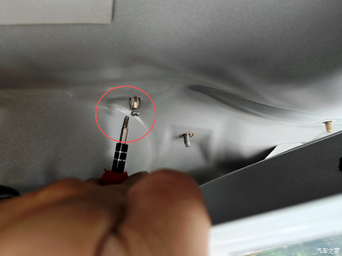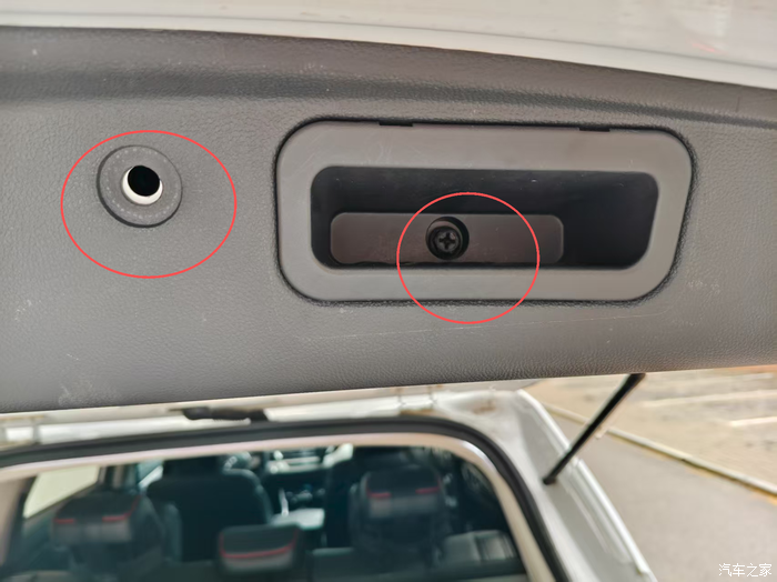 最大的塑料板,需要拆掉锁扣旁边的两个塑料膨胀螺丝,还有后门扶手这里的一颗螺丝,然后大力把盖板搬下来即