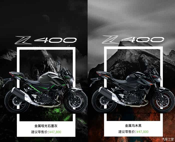 动力和配置方面,新款Z400和Ninja400都未得到更新。搭载一台直列双缸水冷引擎实际排量399cc,最大功率35kW/10000rpm,最大扭矩37Nm/8000rpm,最大马力47.6匹。标配滑动离合器,动力表现处于同级正常水平整体表现以稳定著称,百公里油耗约为3.6升。其他配置上,前减震采用?41 mm套筒式前叉,后Uni Trak多连杆减震,具备可调节功能;前刹车采用单碟半浮动310mm配日清双活塞卡钳,后刹车为单碟固定220mm配双活塞卡钳,标配双通道ABS系统。