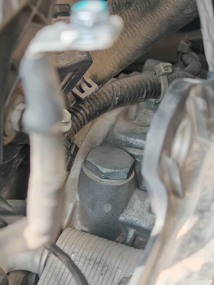 拆卸空滤盒和电瓶后,加油螺丝、变速箱滤芯和排气口映入眼帘。